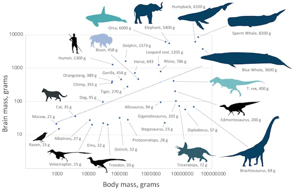 У млекопитающих, тем временем, были другие ограничения. Они так и не эволюционировали в супергигантских травоядных и хищников. Но у них неоднократно развивался большой мозг. Массивный мозг (такой же большой или больше нашего) развился у касаток, кашалотов, китов, слонов, леопардовых тюленей и обезьян.